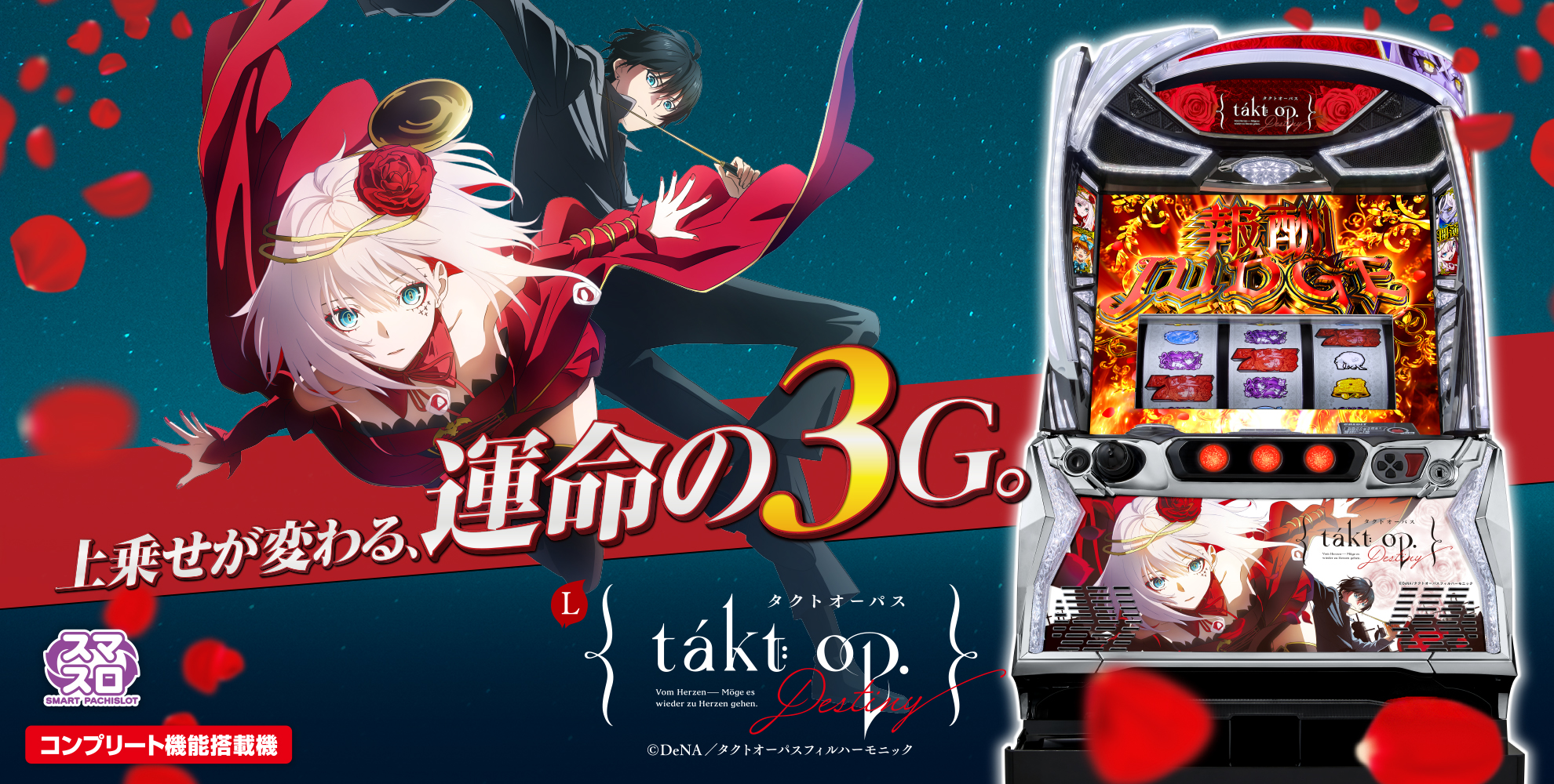メディアミックスプロジェクト「takt op.」を題材にしたA+AT機。デスティニーボーナスを入り口に、AT「バトルオーケストラ」で報酬ジャッジを重ねて出玉を伸ばすゲーム性。最大報酬は3000枚、上位AT「オルフェループ」では期待枚数約3000枚のプレミアム出玉に期待できる。